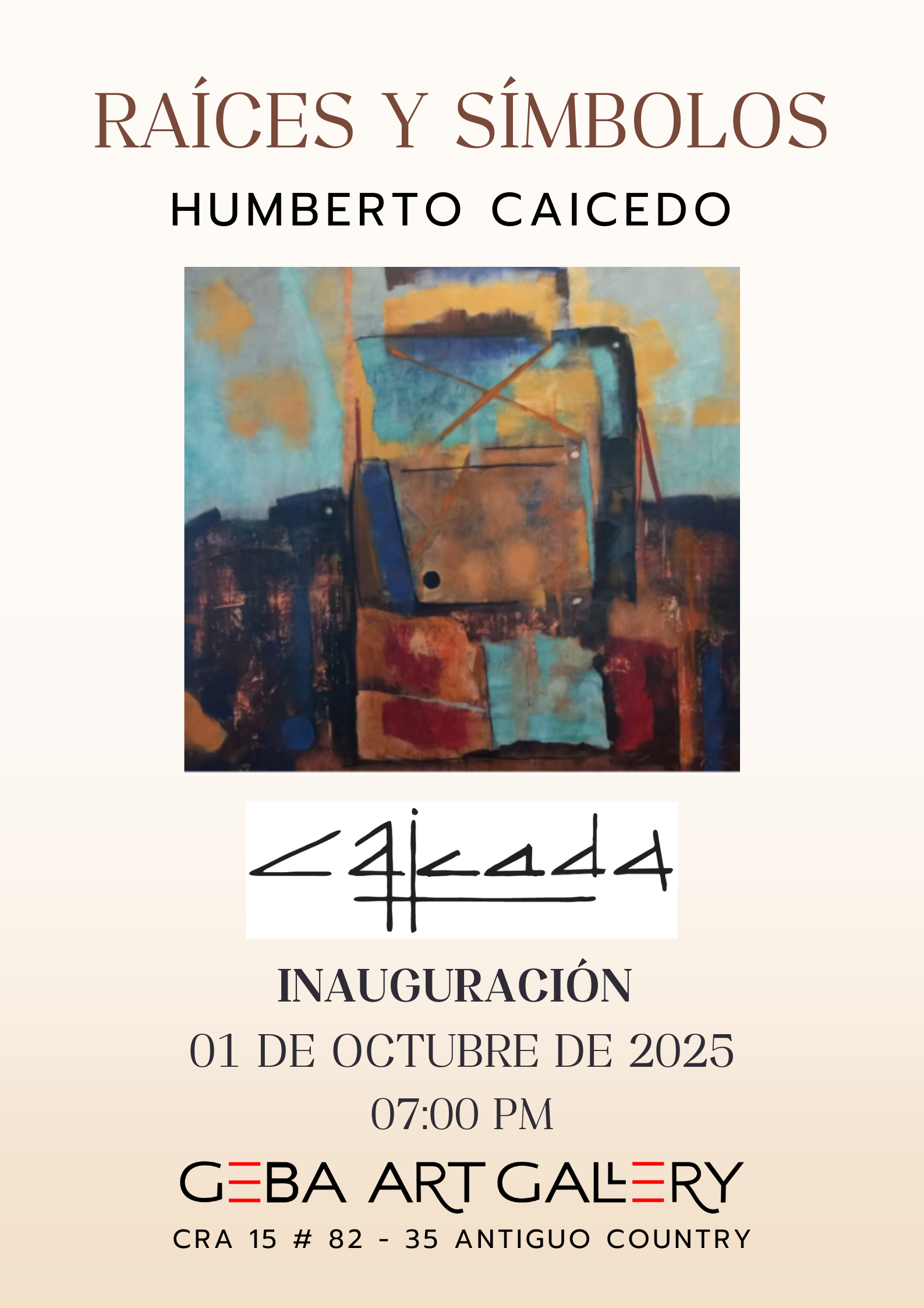 Geba Art Gallery Cra. 15 # 82 - 35, Localidad de Chapinero, Bogotá, DC, Cundinamarca, Bogotá – Colombia, ColombiaRaíces y Símbolos Exposición de Humberto Caicedo Paz En Raíces y Símbolos, Humberto Caicedo Paz nos invita a explorar una serie de obras que profundizan en el vínculo entre el...